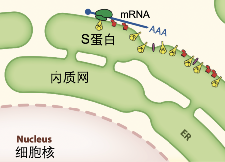 于是司令部翻了一下细胞生物学的教材,发现细胞里最擅长解决这类问题就是内质网。比如,细胞膜上的整合膜蛋白(螺丝钉)就是在内质网被拧到生物膜(铁板)里去的。造钉子和帮着拧钉子的机器在内质网这里都是现成的,病毒只要掺进生产S蛋白的核酸模版,“加冕”第一步就万事大吉了。更神奇的是,被拧上钉子的内质网铁板还可以整张带走,再贴到生产线下游的高尔基体等。这样,“可以带走”的事又有眉目了。司令部里一片欢腾,大家忽然毫不羞耻的觉得寄生生活真好……