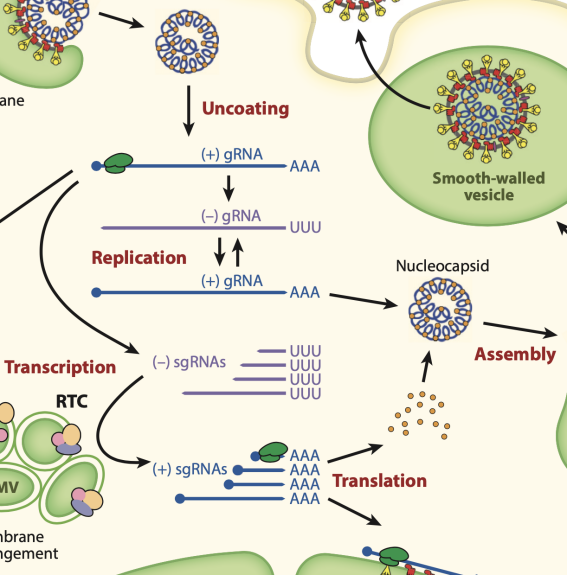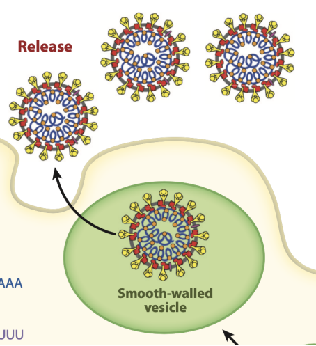 大家回过神来一看,这不正好是一个个完整的新病毒吗,核酸也包起来了,膜也有了,膜上的S蛋白们被这样一折腾,变成了大头朝外,“加冕”就此完成。最后,包裹了大部队的ERGIC和细胞膜发生了融合,新病毒们成功的逃离了被各种利用的宿主细胞,开始了新的克隆之路。