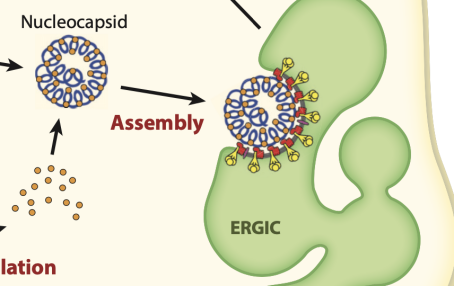 这时,另一路兵马复制出了一大堆准备塞进新病毒的“核酸包”,这些核酸包被吸引到了ERGIC附近,并看到了大头朝里的S蛋白们,核酸包凑了过去,齐心协力往里挤,竟然将含有S的膜一整片挤下来,结果连膜和蛋白带核酸一起掉进了ERGIC里面。