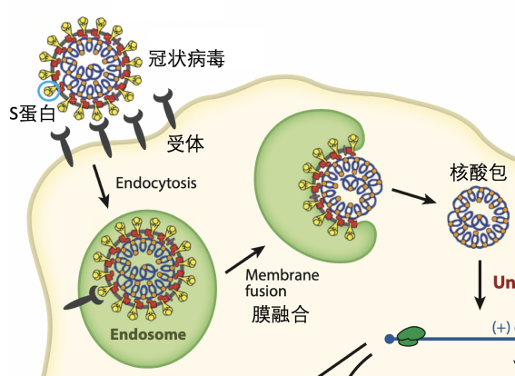 要搞得天翻地覆,病毒就要想办法 “克隆”出一个大部队来。但是病毒的基因组特别简单,能造出干力气活的蛋白就那么几个,每个蛋白都已经被分了很多任务。比如组成“冠”的蛋白,被称为Spike或 S蛋白。就这一个蛋白,需要先识别宿主细胞表面的受体,再完成和宿主膜屏障的融合,才能把作为遗传物质的核酸精准的投放到宿主细胞里面。