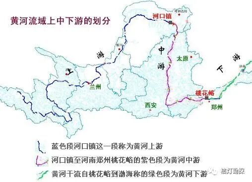 黄河如今的上、中游分界点为内蒙古河口镇,中、下游分界点为河南省桃花峪。