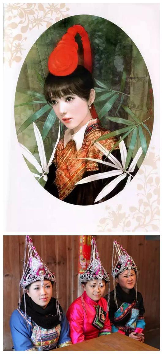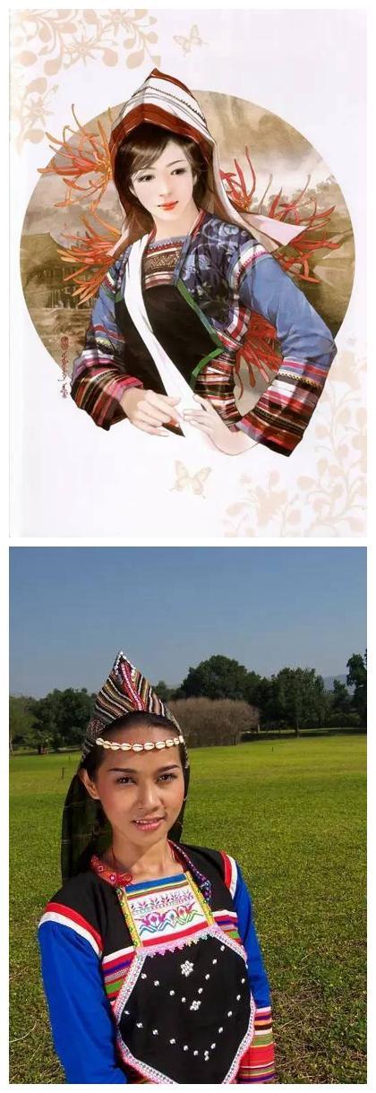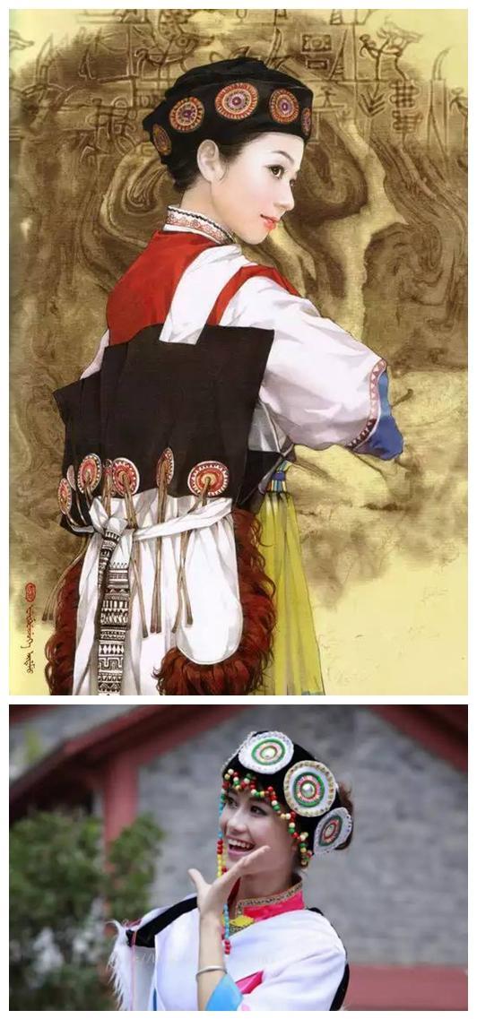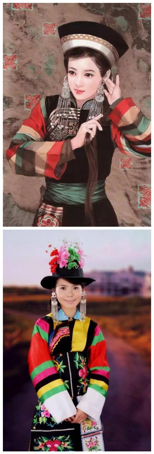 白族主要聚居在云南省大理白族自治州,其余分布于云南各地、贵州省毕节地区及四川凉山州。白族姑娘的头饰非常有特点,有着“风花雪月”的含义。垂下的穗子代表下关的风,艳丽的花饰是上关的花,帽顶的洁白是苍山雪,弯弯的造型是洱海月。