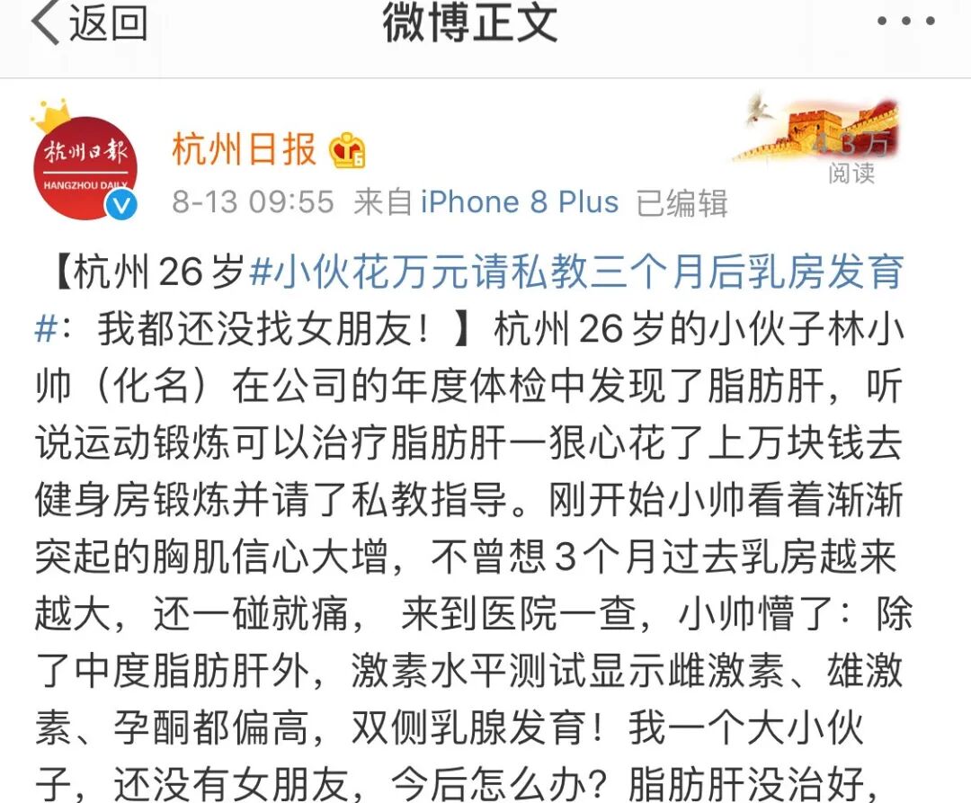 理想很健壮,现实却很丰满,吃了类固醇不一定能让你变成猛男,反而可能让你乳房发育,这个现象被称为「雌化」。当过量的外界雄激素进入体内时,人体自身分泌的雄激素就会减少,导致激素水平的紊乱。