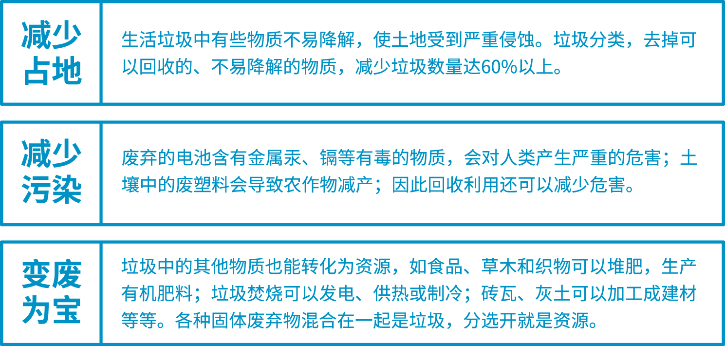 分类的目的就是为了将废弃物分流处理,利用现有生产制造能力,回收利用回收品,包括物质利用和能量利用,填埋处置暂时无法利用的无用垃圾。