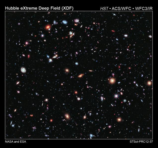 上图是哈勃空间望远镜曝光200万秒,用2000张照片合成的宇宙极深场照,只占天区的12700000分之一,里面就藏着10000个星系,每一个最小的亮点都是一个星系。