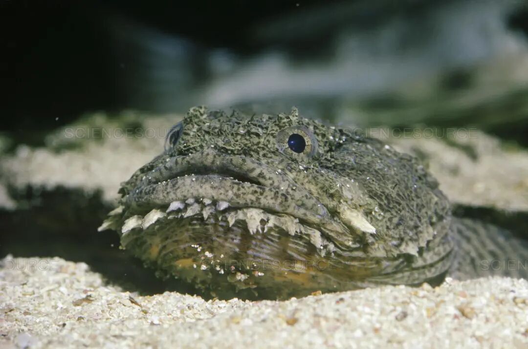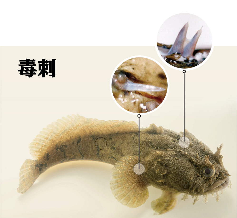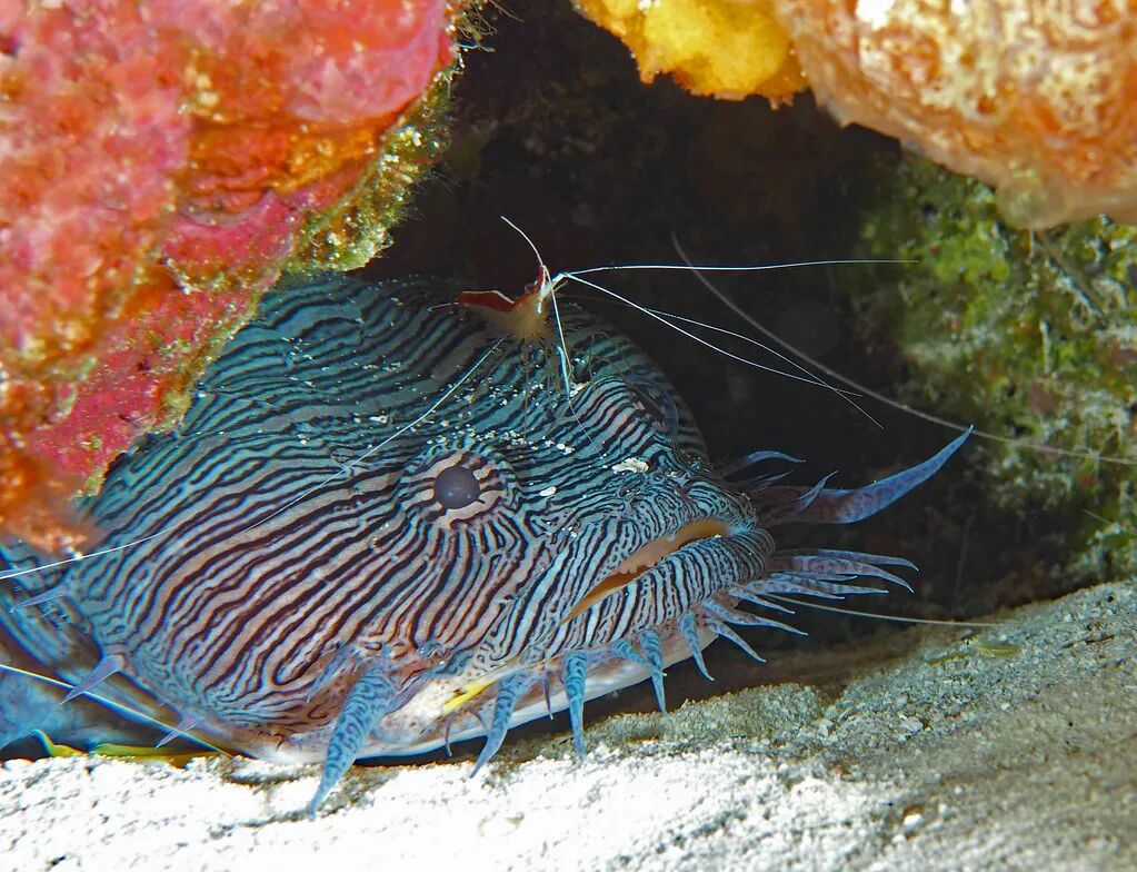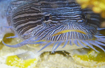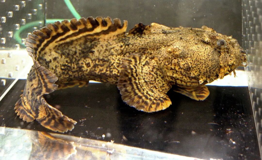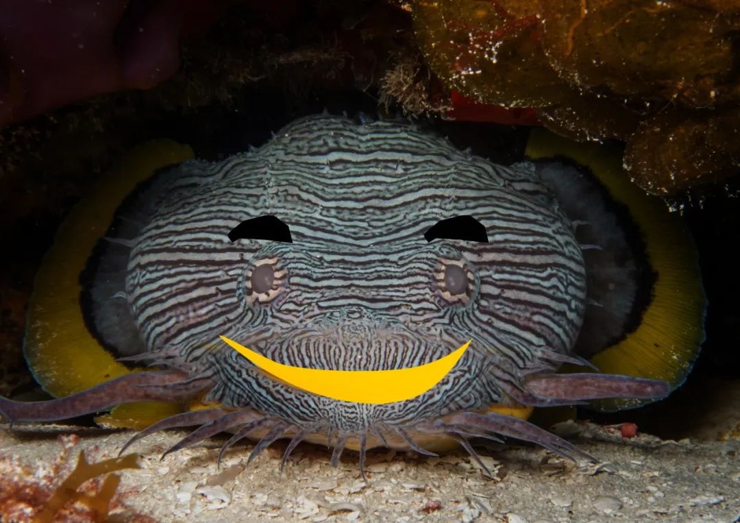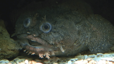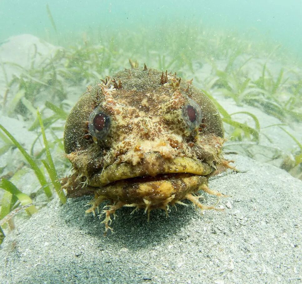 帮派代表Oyster toadfish。最常见的蛤蟆鱼,在浅湾地带石头缝里可以找到他们的身影,它们身体大多呈棕褐色,皮肤有肉状突起,真的很像蛤蟆呀,头部及口缘有许多触须状的小皮瓣(小胡子),身上有毒刺,但是毒性较弱。在印尼四王岛、科莫多等地都能看到它们。
