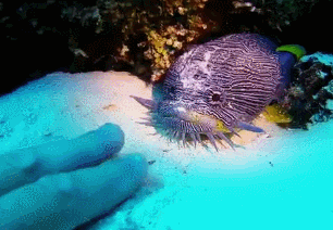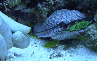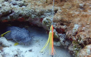 对小鱼和一些小型软体动物几乎无法抗拒,只要你手上拿着什么钥匙链玩具,小挂饰,或者颜色鲜艳小东西,在它眼前上方晃一晃(它只能看到上方),基本上它就控制不住了。在科苏梅尔的很多潜水店都提供这种专门挑逗小玩具....