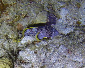 它们最咋眼的就是所有主鳍上都带有的鲜艳柠檬黄色,其实是大部分身体上都有水平的木炭灰色条纹,头部的条纹比较规律,越到身体后部越模糊,感觉像是在水里化掉了...