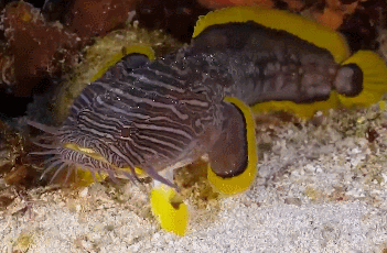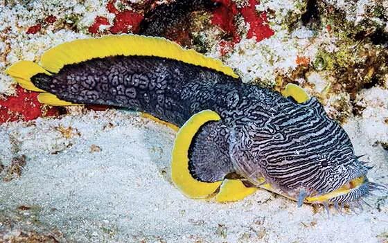 锦绣蟾鱼共有八个鳍。两个背鳍,两个胸鳍,两个腹鳍,一个尾鳍,屁股下面还有一个臀鳍。一般第一眼看见最鲜亮的就是黄黑对比的背鳍、胸鳍和尾鳍。而最特别的是头部下方的一对腹鳍,它们是可以用来走路的。