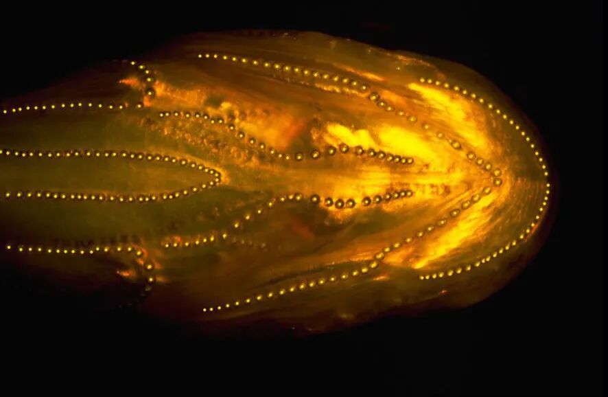 身体侧面和底部有一条或多条侧线神经,神经上的点装在特定情况下可以发光