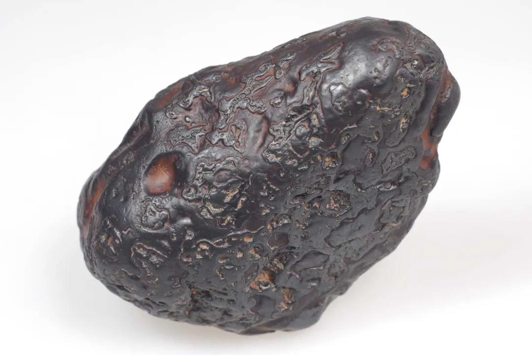 除此之外,陨石在高空飞行时,表面温度达到几千摄氏度。在这样的高温下,陨石表面熔化成了液体。后来由于低层大气的阻拦,它的速度越来越慢,熔化的表面逐渐冷却下来,形成一层薄壳,称之为" 熔壳 "。在熔壳冷却的过程中,空气流动在陨石表面吹过的痕迹也保留下来,称之为" 气印 "。气印的样子很像在面团上按出的手指印。熔壳和气印,是陨石表面的主要特征,也是科学家和收藏爱好者们鉴别陨石的主要标志。下次要是在野外要是遇到陨石,要对照其特点仔细观察,要不然可能就错过了。