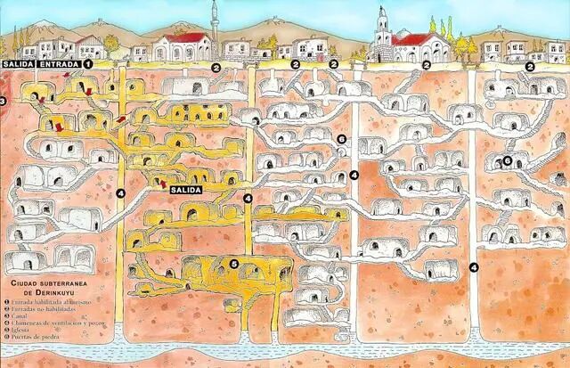 所以德林库尤地下城不仅仅是逃灾避难的处所,居民即使逃到地下城,也能继续地表上的生活,包括做生意——里面公共活动场所、餐厅、杂货店、学校、宗教场所、购物场所等一应俱全;地下城甚至还有停尸房,可以存放尸体,直到地面安全后再运出去埋葬;在地下城的第三层,还有一条5公里长的隧道通往邻近的另一个地下城,可谓面面俱到,连如何跑路都想到了。还有200多个地下城