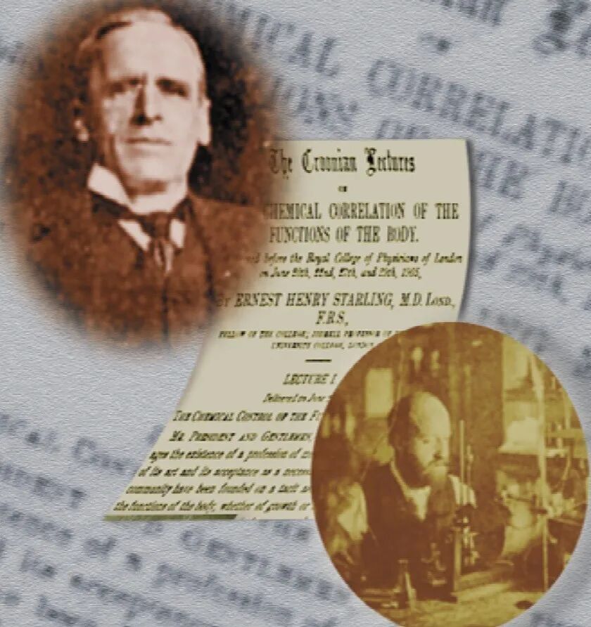 在1902年发表的研究论文上,他们表明当酸到达胃时,空肠粘膜会释放出一种化学信使,该信史通过血液循环刺激胰腺分泌。他们将这种化学信使称为分泌素(secretin)。1905年6月,斯塔林在皇家医学院的克鲁年讲座(Croonian Lecture),“关于机体功能的化学相关性”中,首次使用“激素(hormone)”这个名称。这篇演讲内容发表在当年的《柳叶刀》杂志上。激素源自希腊语,意为“沿着血液从细胞到细胞移动的化学信使,可以协调人体不同部位的活动和生长”。