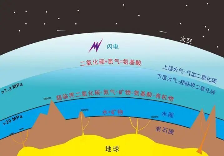 月球形成后的几百万年间,地球的原始大气逐步形成。此时的原始大气中含有大量的水蒸气、二氧化碳、氮气以及少量的一氧化碳、氢气等还原性气体。原始海洋形成后,原始大气的成分变成了以二氧化碳和氮气为主。当温压条件大于31°C和7.3 MPa时,二氧化碳将以超临界流体相态存在,因此在此时的地球表面以上存在超临界态的二氧化碳层。在水圈与大气圈的交界面上,氮气和矿物微粒可以被稠密的超临界二氧化碳流体所吸附。超临界二氧化碳、水、氮气在矿物颗粒的催化下,形成了初始的有机物氨基酸等物质。