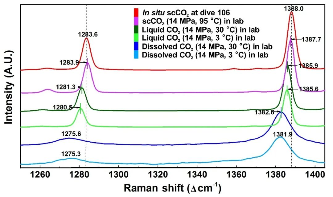 为了进一步确定深海热液区喷出的二氧化碳流体的相态,研究人员利用实验室的深海极端环境模拟系统对不同温压条件下的二氧化碳进行了测量(图3),发现在深海热液区原位获取的二氧化碳拉曼谱峰在频移、半峰宽等光谱参数上与实验室内测量的超临界二氧化碳是完全一致的,进一步确认了深海热液区喷发二氧化碳的超临界相态。