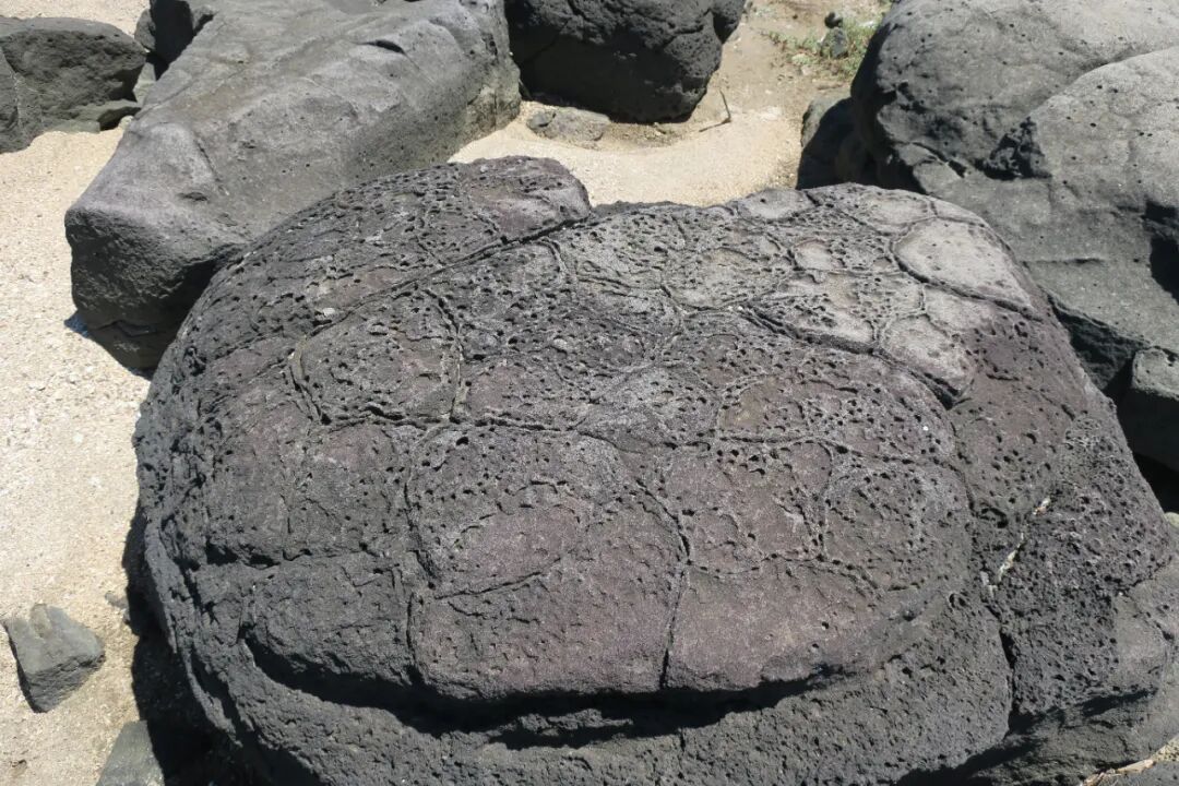 玄武岩除了标志性的柱状形态,有些在冷凝收缩时会产生气孔状的龟裂构造现象。后来经过海水经年累月的冲刷磨蚀,成了惟妙惟肖的龟背石。