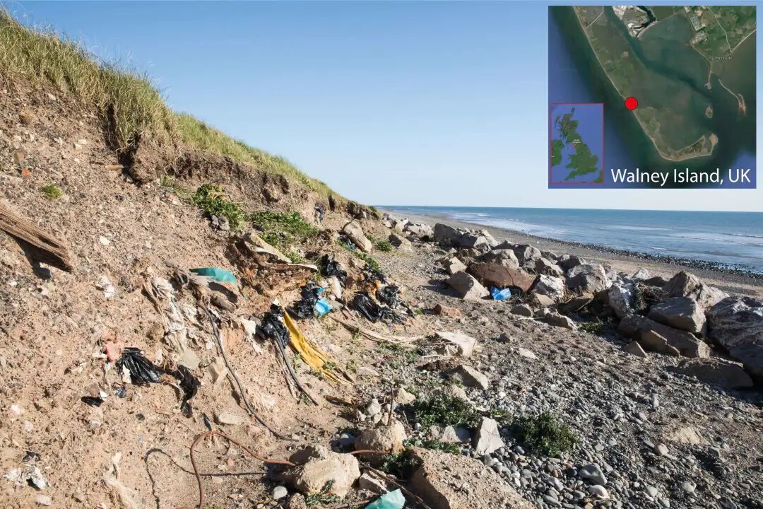 旧垃圾场(如图中英国沃尔尼岛上的这个)的腐蚀,不断将埋藏在地下的塑料垃圾冲入海洋,这些遗留垃圾场遍布世界各地,是海洋塑料污染的许多未量化来源之一。图源:英国国家海洋中心