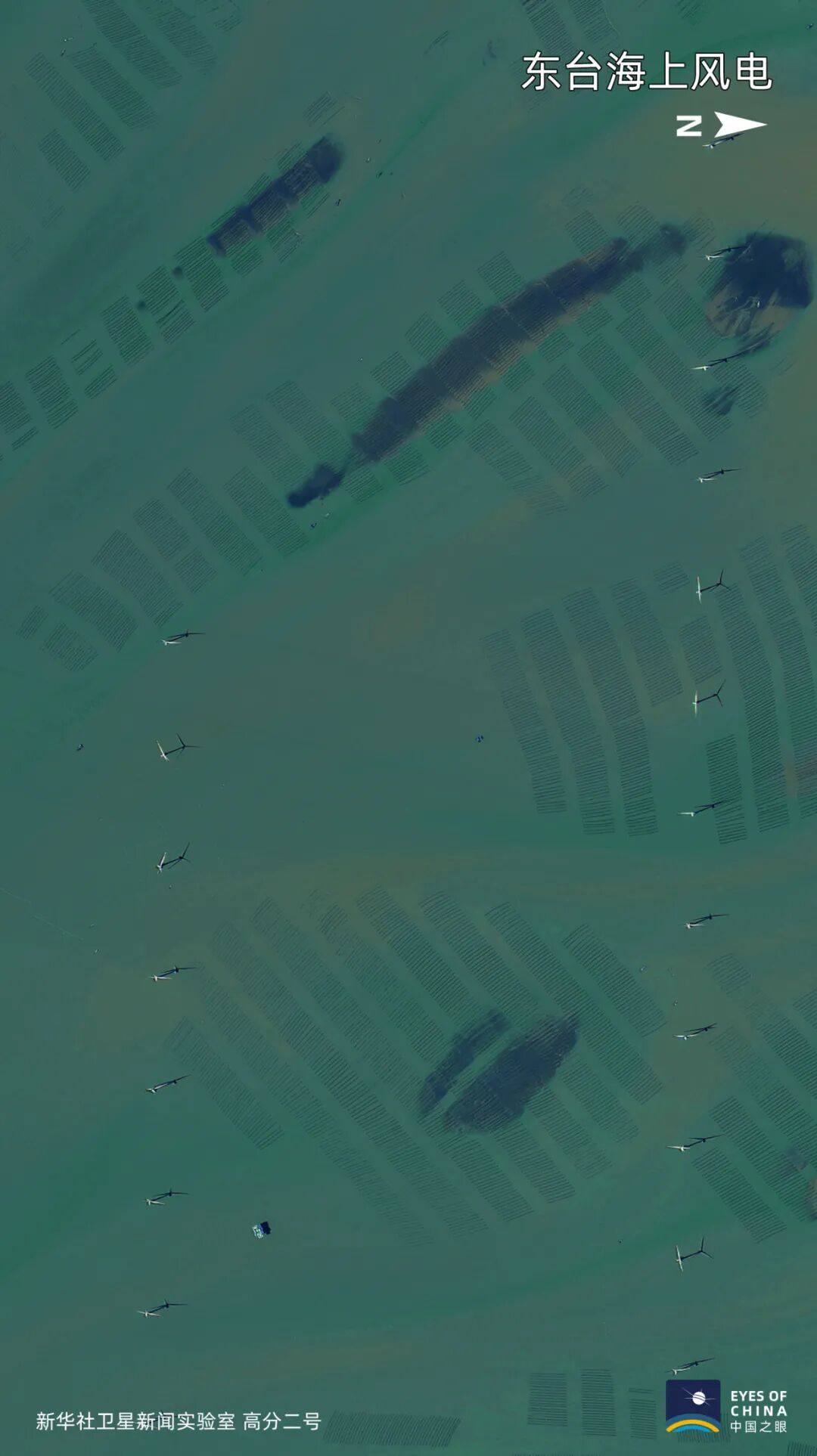 江苏东台,渔排间的海上风电机星星点点。2019年中国可再生能源发电总装机容量达到7.94亿千瓦,占全部电力装机的39.5%。