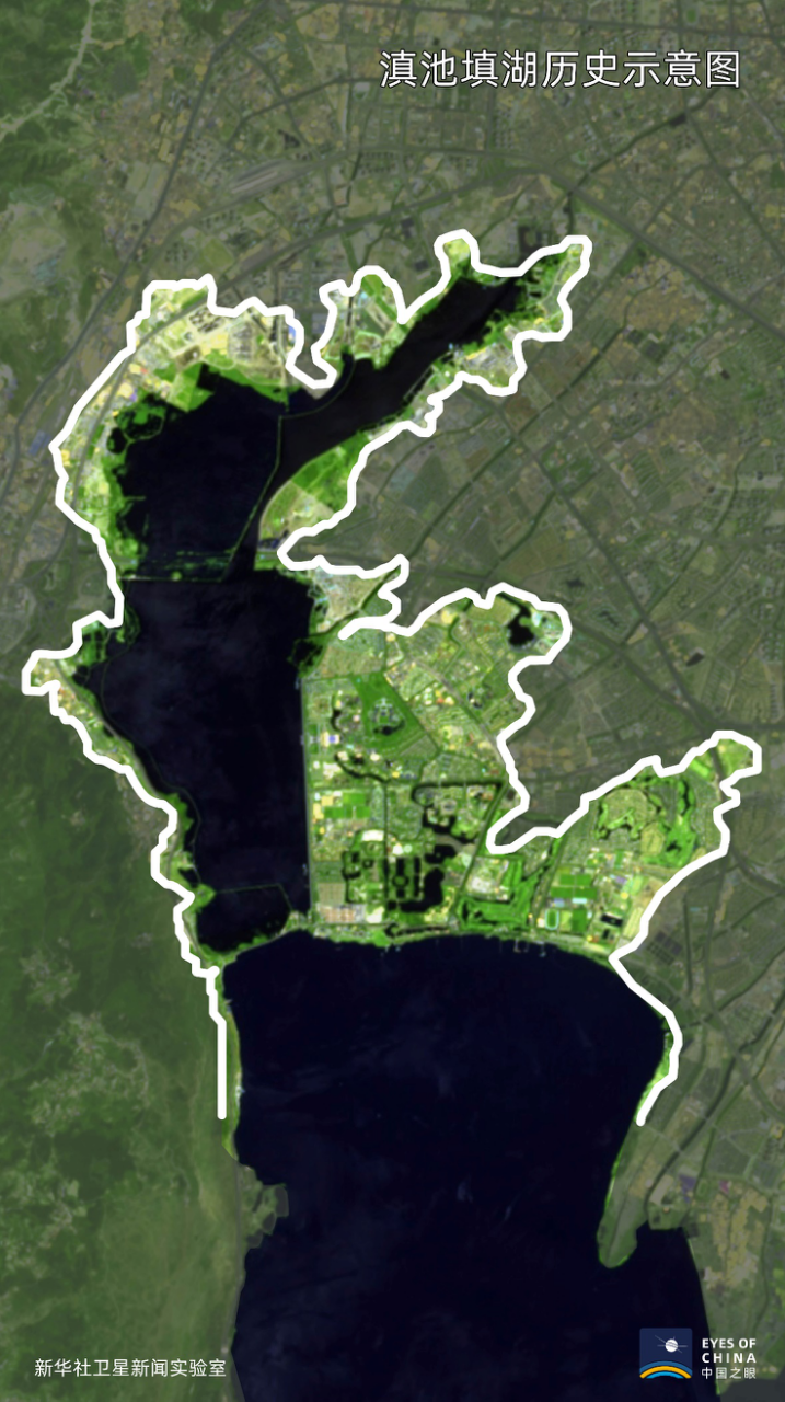 滇池北部填湖示意图,白线内土地为上世纪60年代后填湖所得。