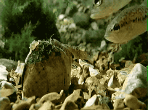 看,前嵴蚌 Epioblasma capsaeformis 抓住了一条小鱼并向它的脸部强行喷射白色蚌仔,围观的小鱼一脸震惊——
