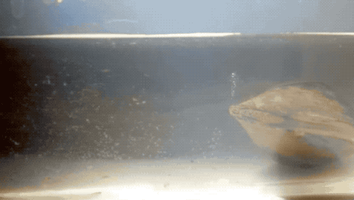 蚌仔爬到妈妈的壳口,等着被喷出去。顺便说一下,河蚌妈妈排出蚌仔的地方也是它排泄的地方,所以蚌仔可以说是和便便一起被喷出来的。