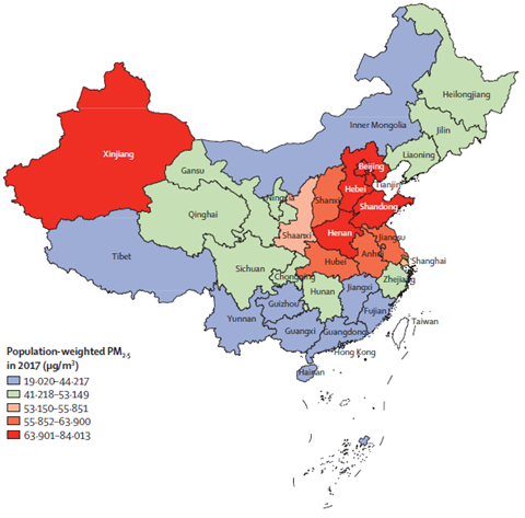 研究者发现,在全国不同省级行政区,空气污染导致的DALY率和死亡率有很大差异,其中归因于大气PM2.5污染的DALY率和死亡率最低的是中国香港(分别为482.3/10万和21.4/10万),最高的是新疆(分别为1725.5/10万和73.7/10万)。