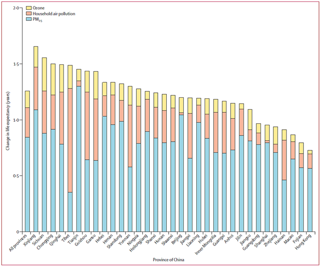 新疆人从空气污染水平降低中的获益最明显,人均寿命将延长1.65年,中国香港获益最小,人均预期寿命仅延长0.73年。