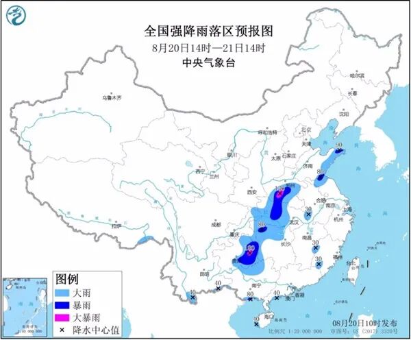 中央气象台8月20日10时继续发布暴雨黄色预警