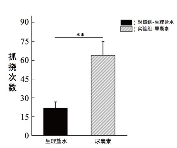 注射尿囊素的小鼠抓挠次数明显要比对照组的次数多很多,这表明尿囊素可以引发小鼠的瘙痒。