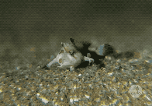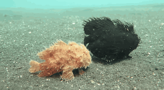 同属𩽾𩾌目的躄/bì/鱼科(Antennariidae)的青蛙鱼们的日常操作也是用胸鳍在海底扑腾。不过躄鱼比手鱼能游,它们的一个绝技就是青蛙喷气机——用嘴吸水然后用鳃喷出去前进。话说𩽾𩾌你是不是被一阵巨浪拍到绝情洋底再也没游回来的?(大雾)