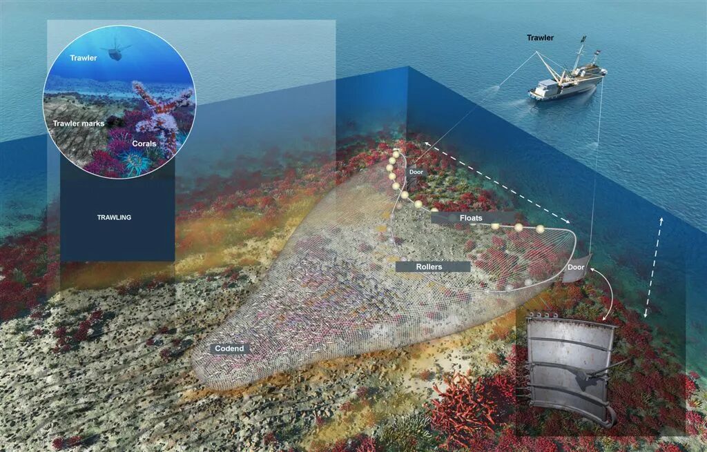 IUCN指出,1967年前,拖网式的扇贝渔船曾在塔斯马尼亚附近海域活动,直接导致了大量手鱼被意外捕获。拖网式捕捞是一种臭名昭著的捕捞方式,这种捕捞方法可以用“赶尽杀绝”来描述。拖网在海底地毯式地拉过去,不光要捕的海产进去了,不要的海产也进去了。