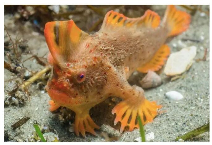 对的,并不是所有的鱼都会游泳。这种几乎不游泳的鱼就叫做手鱼(Brachionichthyidae),属于𩽾𩾌目,和深海的那种𩽾𩾌鱼有亲缘关系。和𩽾𩾌鱼类似,它们也是用嘴巴上面的诱饵捕猎,最爱吃的是甲壳动物和软体动物。