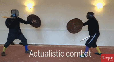 然后,研究者请来擅长古代剑术的击剑手,让他们参考一本来自中世纪的击剑手册,用这些复刻青铜兵器开始了操练。与此同时,研究者们则忙着用高速摄影记录“战斗过程”,并在每轮“对战”结束后立即观察武器上出现的伤痕。