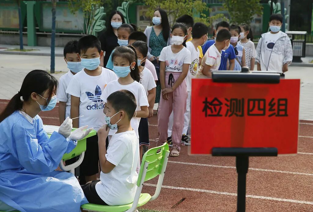 8月23日,石家庄市育新实验小学操场上,医护人员为学生们采集核酸检测标本。据悉,石家庄市中小学将于9月1日正式开学,校园核酸检测工作将在学生返校之前全部完成。