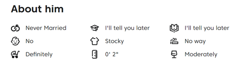 信息栏中还标明了罗密欧是未婚,身材矮壮,不抽烟,没带孩子...
