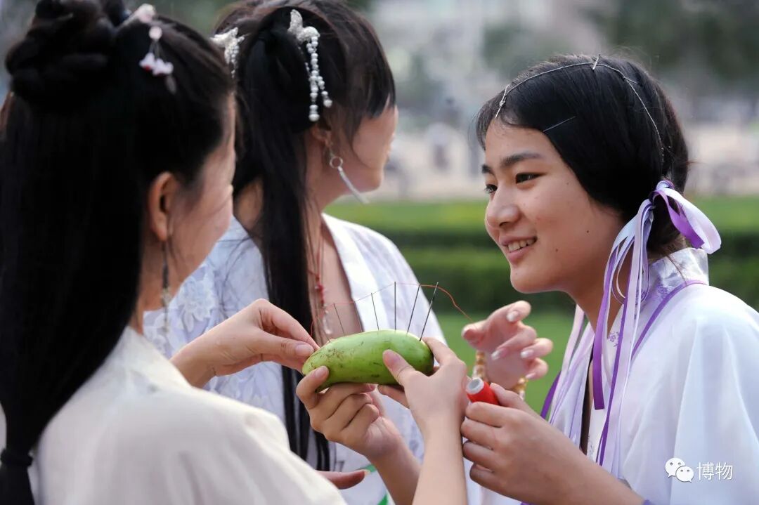 七夕也是人间女子祭祀织女的“乞巧节”。姑娘们在七夕之夜拈香拜月,摆放时鲜瓜果,用穿多孔针等游戏来向织女祈求智慧、灵巧和幸福。