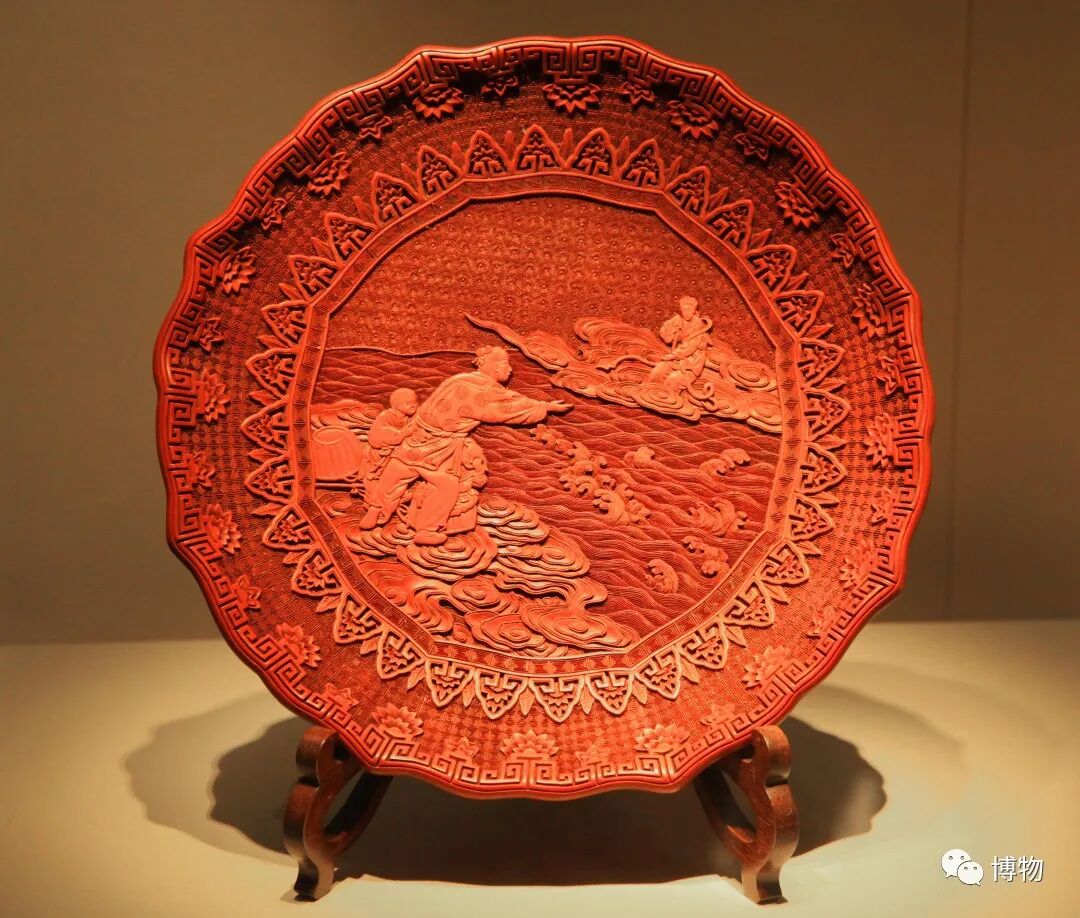 清代扬州出品的雕红漆盘,盘心图案是牵牛织女被天河隔开后的悲情对望