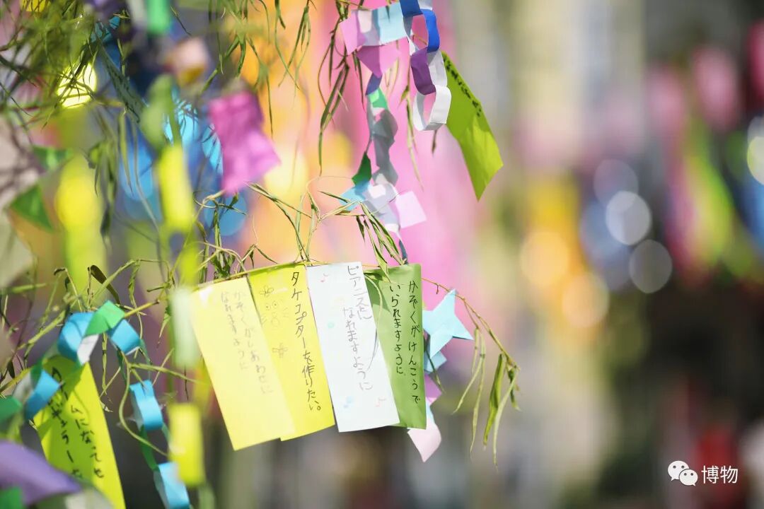 这个节日从中国传到日本之后,变成了纯粹的祈福节日,不限性别年龄、不计愿望内容,人人都可以向织女许愿。人们会将千奇百怪的愿望写在彩色纸签上,悬挂于竹枝。