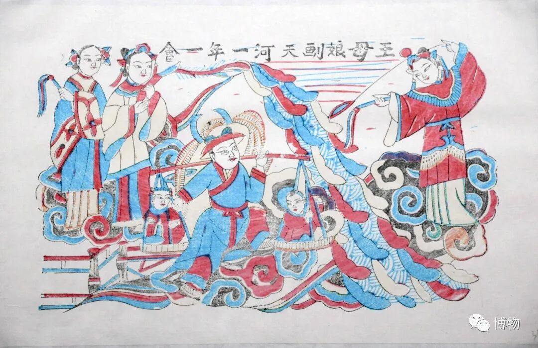 木版水印年画描绘了王母娘娘划出银河阻隔二人的场景