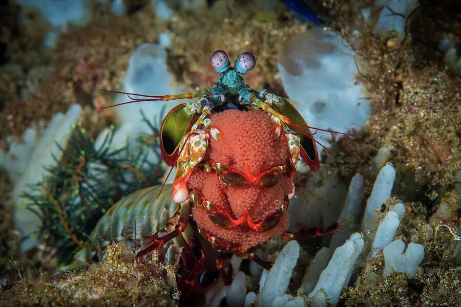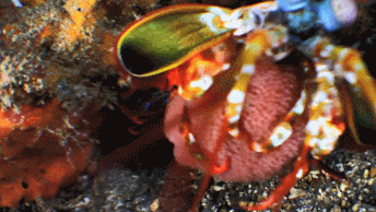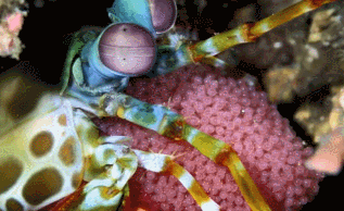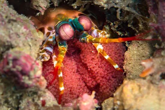 孔雀螳螂虾通常都是一夫一妻制,雄性的外壳会非常艳丽,颜值爆表的才能最快的吸引到雌性。一旦雌性根据他华丽的甲壳选择了她的伴侣后,她就会接受他传给她的精子包裹,然后她再释放了卵子,被精子受精。