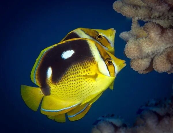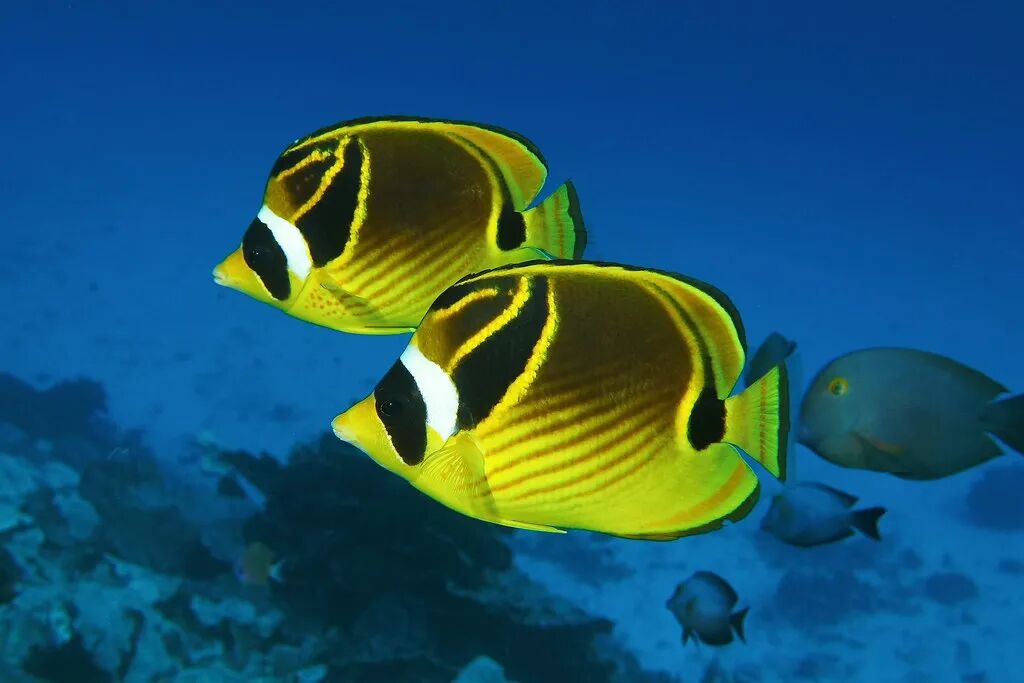 蝴蝶鱼有12属120多种。这种色彩鲜艳、巴掌大小的珊瑚礁住客,以一夫一妻制成双成对地群居在一起,它们和小丑鱼类似,领地意识非常强烈,有非常强的社会性。