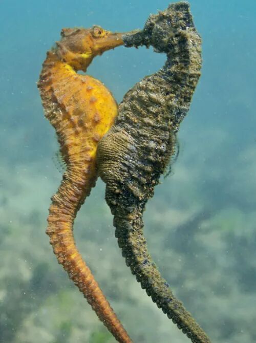 求偶之初,雌雄海马会用尾巴相互缠绕数日,期间,它们会一起旋转并变换颜色;之后,雄性海马才开始进行一场时长达8小时的“求偶之舞”,这是一个求爱的行为。在相互认同后,它们便会一生尊崇一夫一妻制,他们会彼此分享一切。