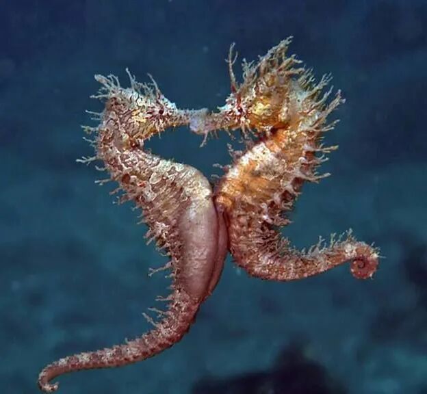 接下来雌性海马会以非常奇特的方式休她的产假,而雄性海马则担任怀孕的角色,当海马完成交配之后,雄性海马会把受精卵放在自己的育儿袋里,这样雌性海马就能够减轻种种负担,集中精力产更多的卵。