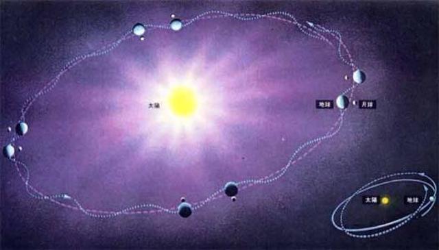 从以上轨道参数可以看出,地球公转轨道和月球公转轨道都是一个近似圆形的椭圆形,日地距离近地点和远地点相差约500万千米。现在我们忽略地月距离远地点和近地点4.9万千米差距,即便月球的远地点,也还不到日地近日点与远日点距离差距的十分之一,因此月球轨道完全被涵盖在地球轨道之中了。