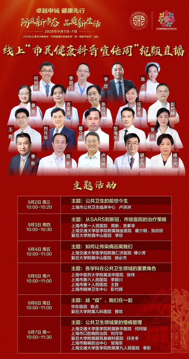 同时,9月2日-7日,申康中心官方微信服务号“申康科普周”每日推送一个科普话题,以直播形式进行科普宣传,申康中心官网同步发布。主要内容将聚焦在抗疫防病和公共卫生领域,打造“市级医院健康科普信息平台”。