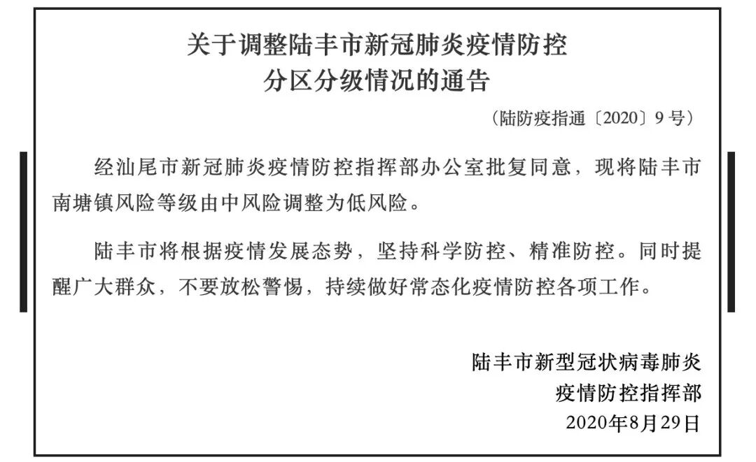 ●8月29日,广东省陆丰市发布《关于调整陆丰市新冠肺炎疫情防控分区分级情况的通告》,通告表示,经汕尾市新冠肺炎疫情防控指挥部办公室批复同意,现将陆丰市南塘镇风险等级由中风险调整为低风险。至此,全国中高风险地区全部清零!(来源:北京日报)
