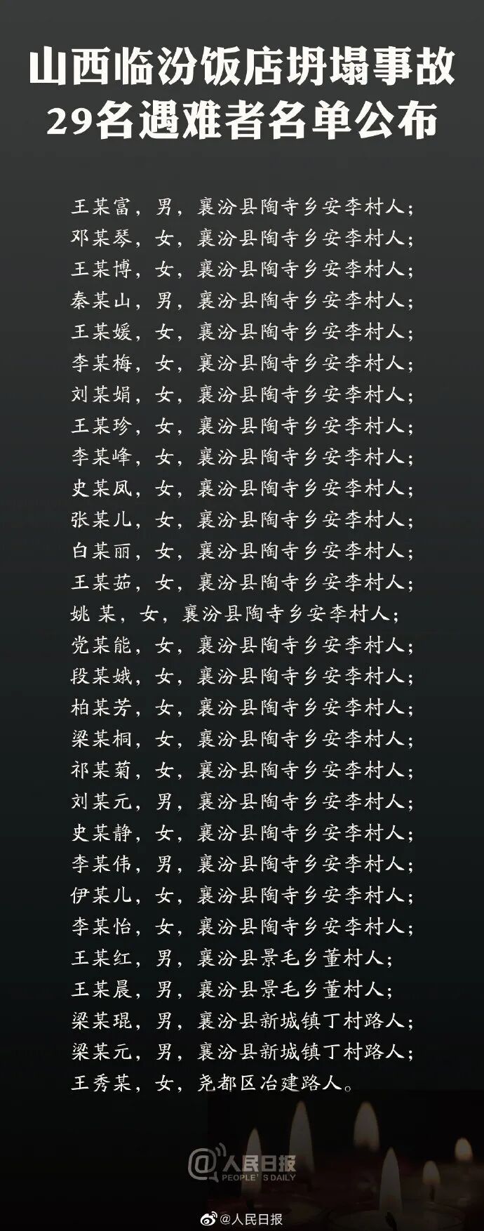 8月29日9时40分左右,临汾市襄汾县陶寺乡陈庄村聚仙饭店发生坍塌事故,被困57人。经紧张搜救,截至8月30日3时52分,被困人员全部救出,其中29人遇难,7人重伤,21人轻伤。