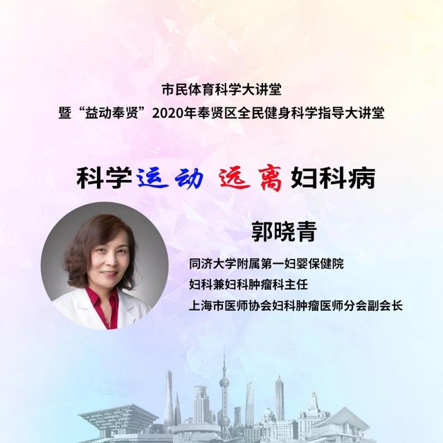 市民体育科学大讲堂暨“益动奉贤”2020年奉贤区全民健身科学指导大讲堂特别邀请同济大学附属第一妇婴保健院郭晓青主任医师,带来《科学运动,远离妇科病》专题,向广大女性市民科普妇科疾病运动防治知识,郭主任还将在现场演示和教学一些针对女性的科学运动方法。