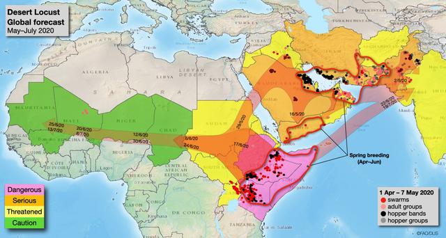 还有一个则是横扫了南亚和东非的蝗虫危机,这个危机最早可以追溯到2018年的阿拉伯半岛季风雨时期,季风雨提供了繁殖条件,因在无人区,结果蝗虫繁殖了两季蔓延才发现,但为时已晚,蝗虫迁飞到了东非和南亚,一直到现在东非诸国和印度以及巴基斯坦和伊朗仍然在灭蝗,如果不能控制,它们将继续肆虐至2020年!