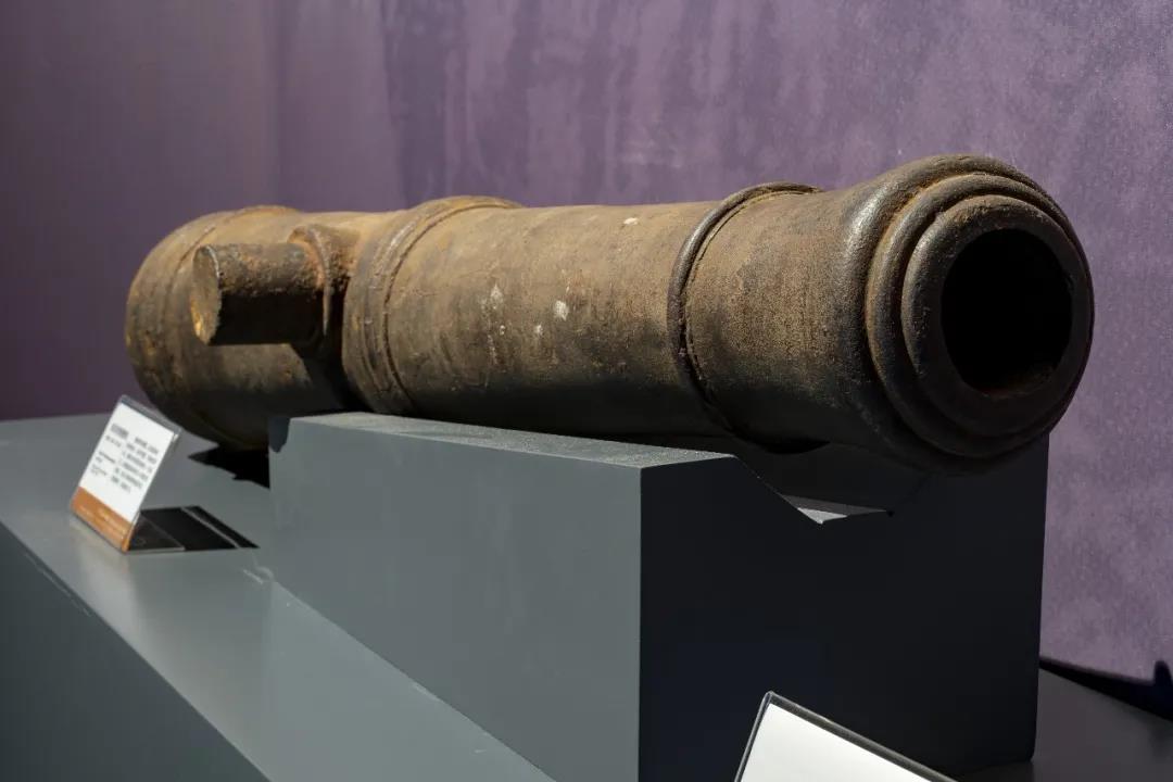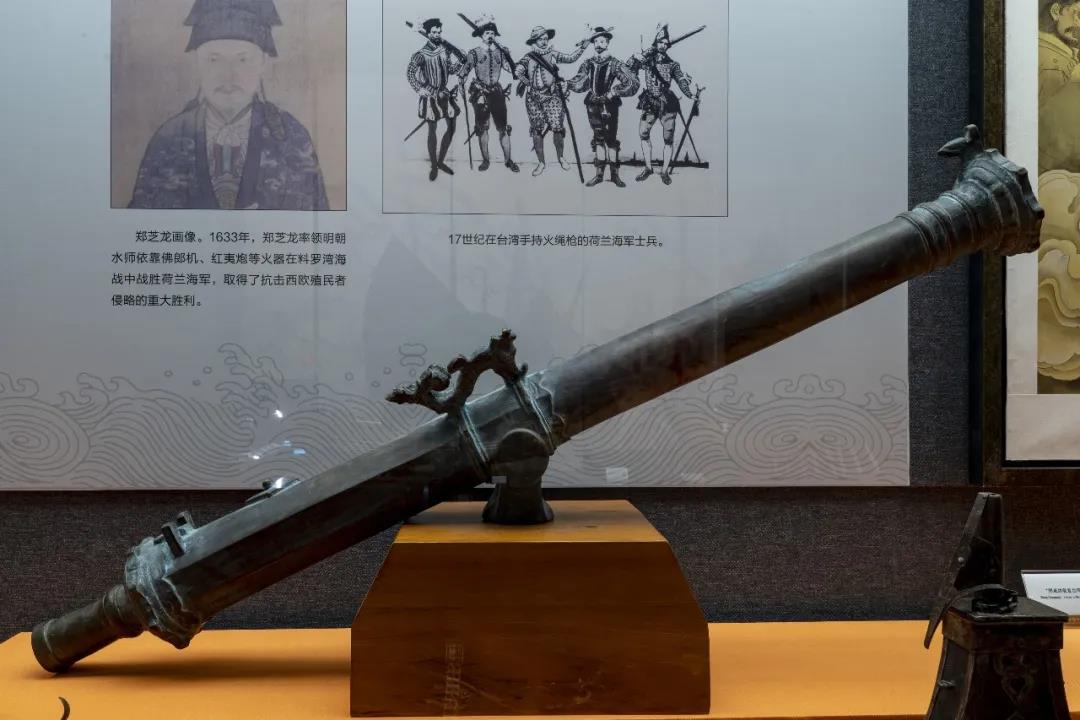 展厅中的“红夷炮”是一种前装滑膛舰炮,被用于海战中。该舰炮有多道箍,以加固炮身;炮身细长,保存完整,顶端有球珠,炮管中间两侧各横出一只炮耳。它同中国传统铳炮相比,具有坚固耐用,发射威力大等优点。